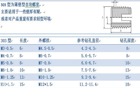 武汉自攻螺套外观上看主要有两种区分,一种是一端开槽型的,另一种是一端三圆孔型的,其中开圆孔型的又分为307型和308型两种,307型和308型外观主要区别就是同一直径下,长度和外径大小有所区分。以上各种型式螺套均具有自行攻牙功能。